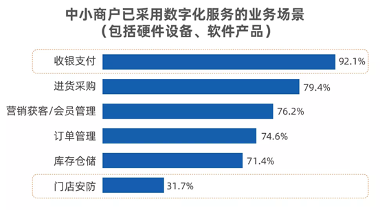 以智能收銀為代表的支付設(shè)備是推動(dòng)中小商戶數(shù)字化的抓手。從門店數(shù)字化應(yīng)用環(huán)節(jié)占比來看,收銀支付的占比高達(dá)92.1%,同時(shí),超過70%的受訪企業(yè)表示在進(jìn)貨采購、營銷獲客/會(huì)員管理、訂單管理、庫存?zhèn)}儲(chǔ)等環(huán)節(jié)也采用了數(shù)字化服務(wù)。