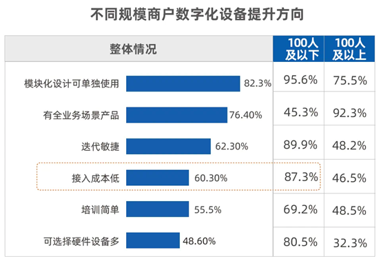 根據(jù)調(diào)研,不同規(guī)模商家均認(rèn)為操作簡便、與其他設(shè)備的良好兼容性、價(jià)格低廉是數(shù)字化硬件設(shè)備最核心的三項(xiàng)特質(zhì)。其中100人以下企業(yè)對操作簡單和兼容性要求更高。