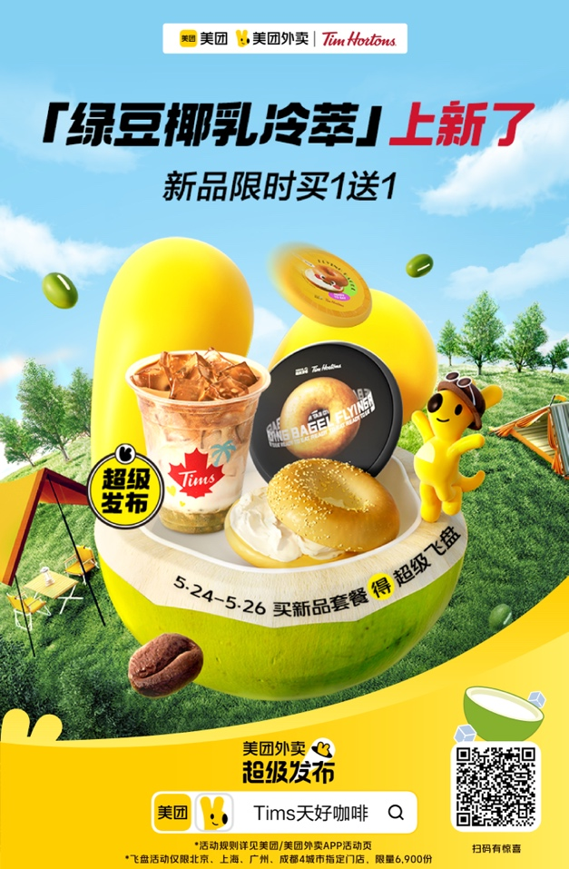 在新品活動(dòng)中,Tims依托美團(tuán)外賣推出的“超級(jí)發(fā)布”平臺(tái),聯(lián)名發(fā)布“新、潮、酷、趣”的限定新品及“貝果”飛盤,精準(zhǔn)捕獲年輕人展現(xiàn)出來(lái)的運(yùn)動(dòng)、戶外、顏值、美味、便捷等“興趣元素”,為年輕人帶來(lái)全新的積極情緒和品質(zhì)生活潮流,成為多元化興趣價(jià)值實(shí)現(xiàn)的新探索。