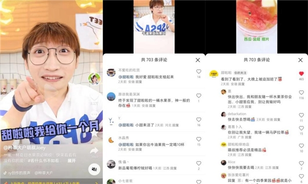 8月12日,萌叔在夏日鮮果茶測(cè)評(píng)中,甜啦啦售價(jià)10元的一桶水果茶,由于其真材實(shí)料、價(jià)格親民被萌叔力薦,當(dāng)萌叔測(cè)評(píng)到其他品牌牛油果單品的時(shí)候,精準(zhǔn)把握甜啦啦品牌“高質(zhì)價(jià)比”基因,喊話甜啦啦“一個(gè)月把牛油果飲品價(jià)格打下來(lái)”。