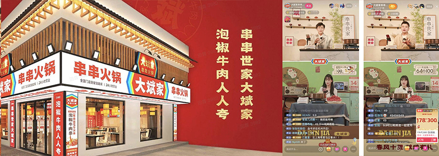 針對火鍋的聚餐屬性,大斌家打造“代金券主推+單品秒殺+套餐搭配”商品組合,主推多種面額代金券“178代300,49代100代金券”等,滿足不同人群聚餐消費場景 同時,大斌家創(chuàng)意打造“同屏雙城雙場景”直播——長沙、南京雙城連線,兩地主播分別在簡約現(xiàn)代和復(fù)古國風(fēng)的場景中,開啟招牌菜“泡椒牛肉串串”吃播,與用戶互動抽取福袋大禮,持續(xù)推動熱度升溫。將抖音首播打造成年度營銷大事件,快速打入目標(biāo)消費群體,讓大斌家不僅收獲810萬銷售額,更達(dá)成了近1000萬的直播曝光量,以大場直播實現(xiàn)“品效合一”。