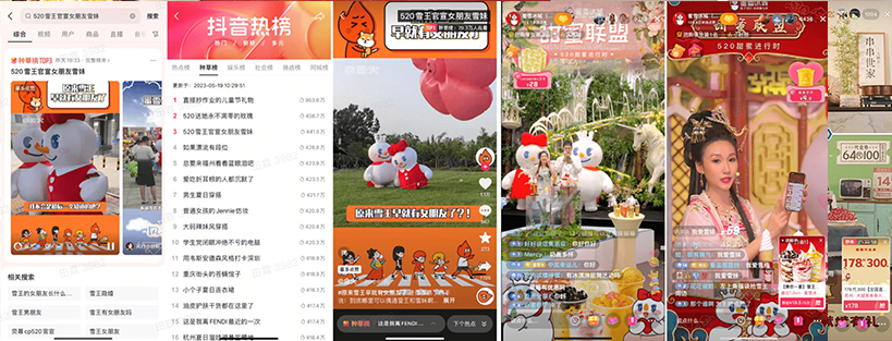 今年,在520節(jié)慶氛圍下,蜜雪冰城以其IP雪王雪妹婚慶為主題,結(jié)合品牌年輕調(diào)性和迎合Z世代受眾人群,進(jìn)行直播間和短視頻內(nèi)容打造,話題#520雪王官宣女朋友雪妹 相關(guān)短視頻播放量超6000萬。