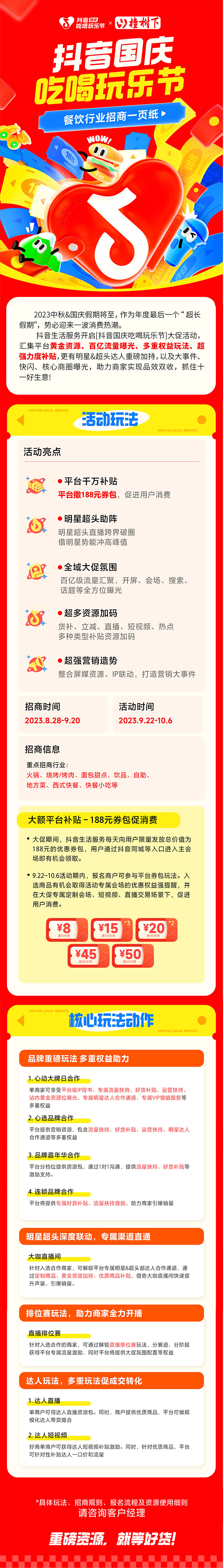 今年,針對火熱的十一黃金周假期到來,抖音生活服務(wù)特推出“抖音國慶吃喝玩樂節(jié)”,用百億流量曝光資源、多重權(quán)益玩法,助力餐飲商戶抓住十一黃金周: