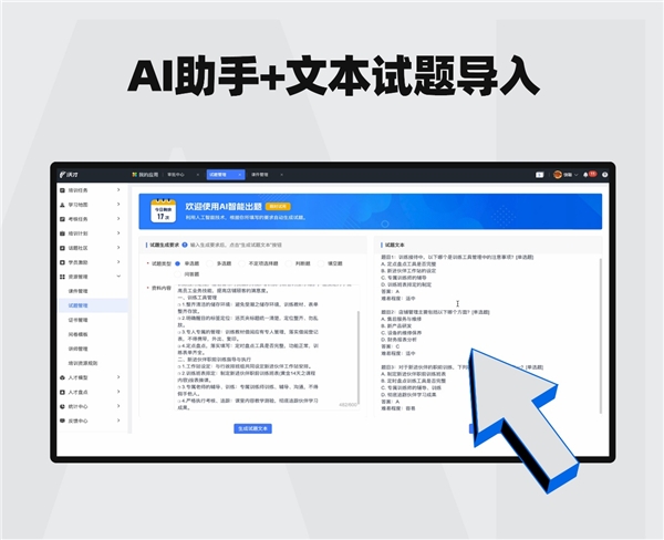 沃才3.0版本通過(guò)運(yùn)用先進(jìn)的人工智能技術(shù),推出了AI助手和文本試題導(dǎo)入功能,幫助企業(yè)一鍵研發(fā)考題及輕松創(chuàng)建在線考試。在使用中,只需將內(nèi)部培訓(xùn)資料文本粘貼輸入,僅幾秒鐘,AI助手就可以根據(jù)資料內(nèi)容自動(dòng)生成完整試題,生成后試題可在平臺(tái)中直接引用到考試場(chǎng)景。這極大地節(jié)省了企業(yè)培訓(xùn)人員在出考題和上傳試題的時(shí)間,讓培訓(xùn)工作效率更卓越。