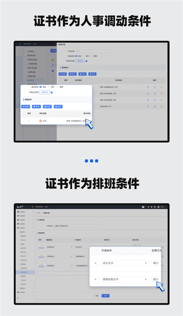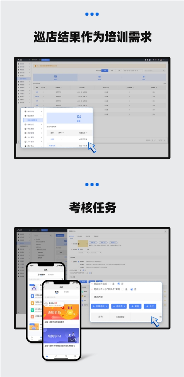 在解決方案一體化上,我們通過(guò)實(shí)現(xiàn)證書作為員工的人事調(diào)動(dòng)及日常排班條件,巡店結(jié)果作為培訓(xùn)需求依據(jù),考核任務(wù)作為門店監(jiān)管及店長(zhǎng)運(yùn)營(yíng)助手,從而提升了人事審批及排班流程的效率,解決了信息孤島問(wèn)題,并且?guī)椭髽I(yè)精準(zhǔn)定位門店管理存在的不足之處,以此來(lái)制定有效的培訓(xùn)計(jì)劃。