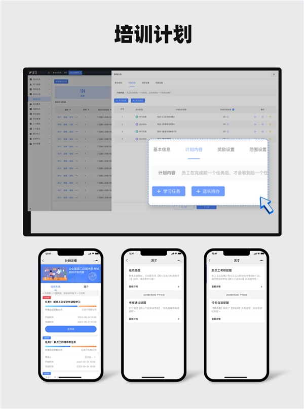 沃才3.0在流程自動(dòng)化的實(shí)現(xiàn)上,我們推出了“培訓(xùn)計(jì)劃”功能。它可以將多個(gè)學(xué)習(xí)任務(wù)或店長(zhǎng)待辦組成一個(gè)任務(wù)鏈,員工完成上一個(gè)任務(wù)后會(huì)自動(dòng)觸發(fā)下一個(gè)任務(wù),按規(guī)劃學(xué)習(xí),用考試檢核;訓(xùn)練員/師父/管理者可實(shí)時(shí)關(guān)注,線上線下進(jìn)度一致,實(shí)現(xiàn)了多種培訓(xùn)場(chǎng)景的流程自動(dòng)化。