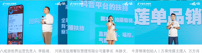 活動現(xiàn)場,三位品牌代表的干活分享和技能點拉滿收獲陣陣掌聲。作為商家,更需要具備的是了解達人市場,找到好的達人,用好達人。八戒游世界運營負責人李振靖代表服務商現(xiàn)身說法商家如何在抖音生活服務業(yè)務生態(tài)體系中,借力達人實現(xiàn)品效合一,提升GMV。河南吾飯湘餐飲管理有限公司董事長朱靜文從打造個人IP,從內容破圈,放大餐飲新能量。牛芽鮮果創(chuàng)始人丨萬果傳媒主理人萬方肖分享了一家鮮果店從0-1的抖音經營之旅,深挖線上陣地建設過程中的困難、經驗、思考,為更多同行提供實戰(zhàn)經驗。